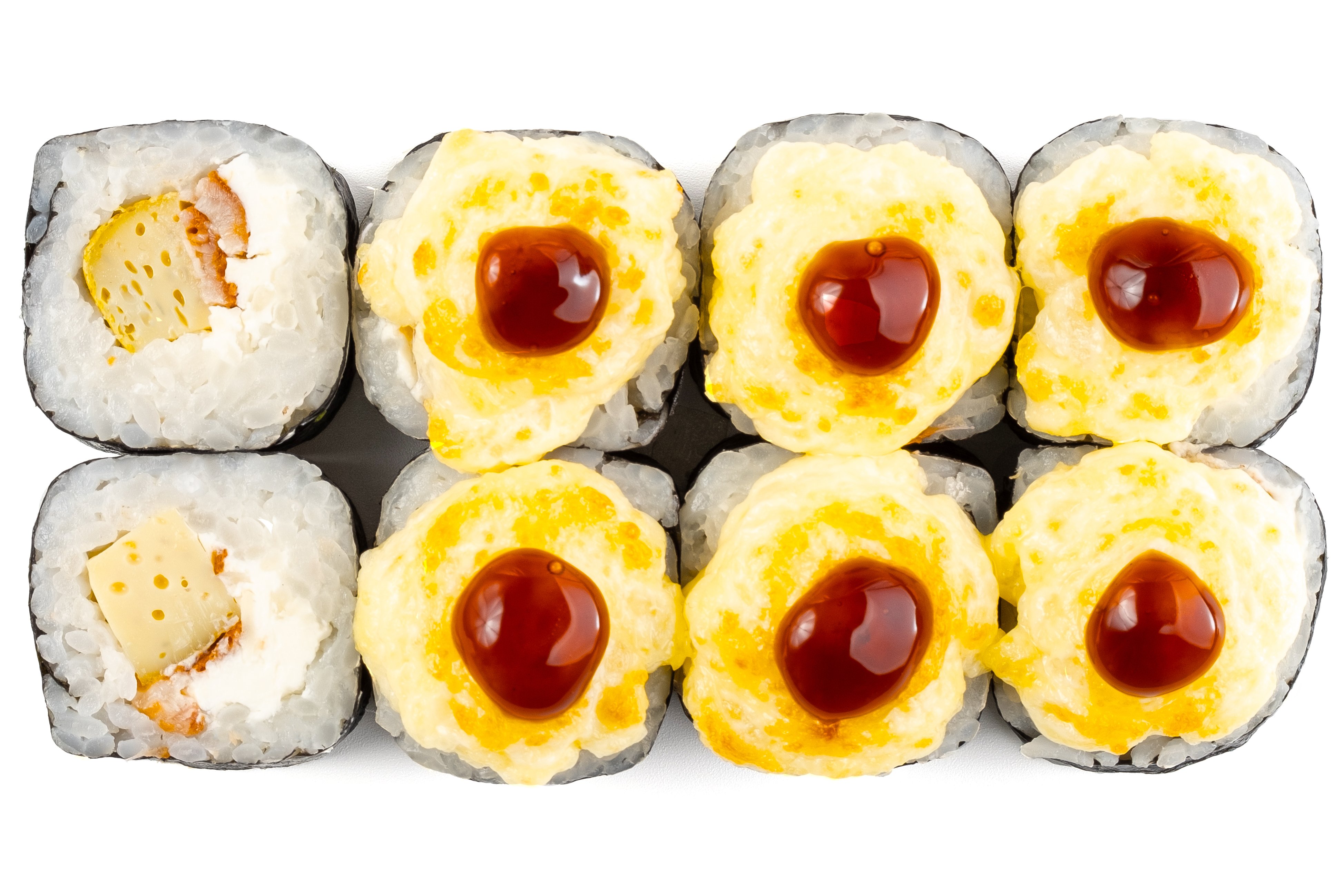 Рис, Нори, Омлет Тамаго, Сыр сливочный, Угорь, Шапка (моцарелла, майонез, чеснок), Соус Унаги,