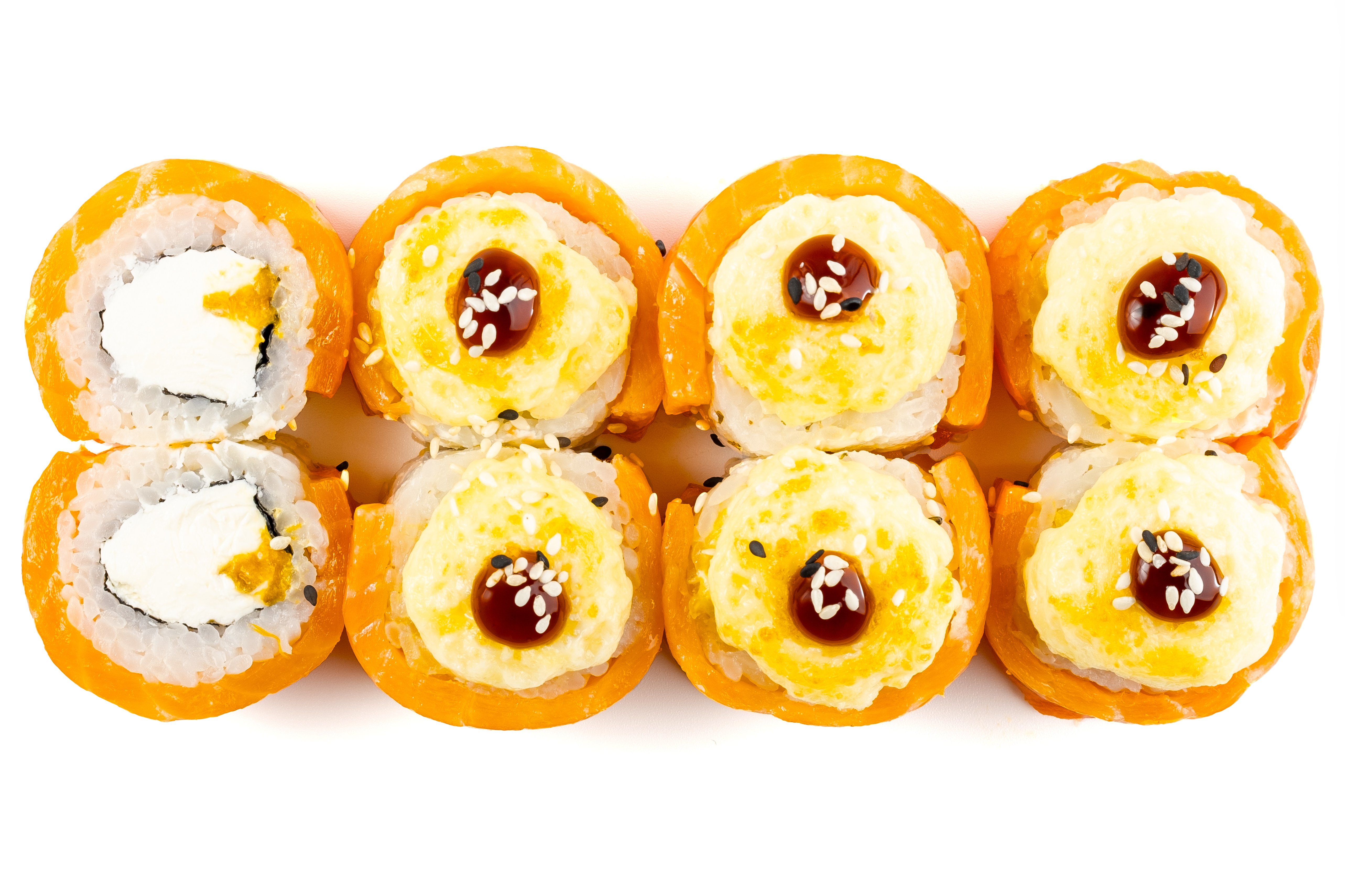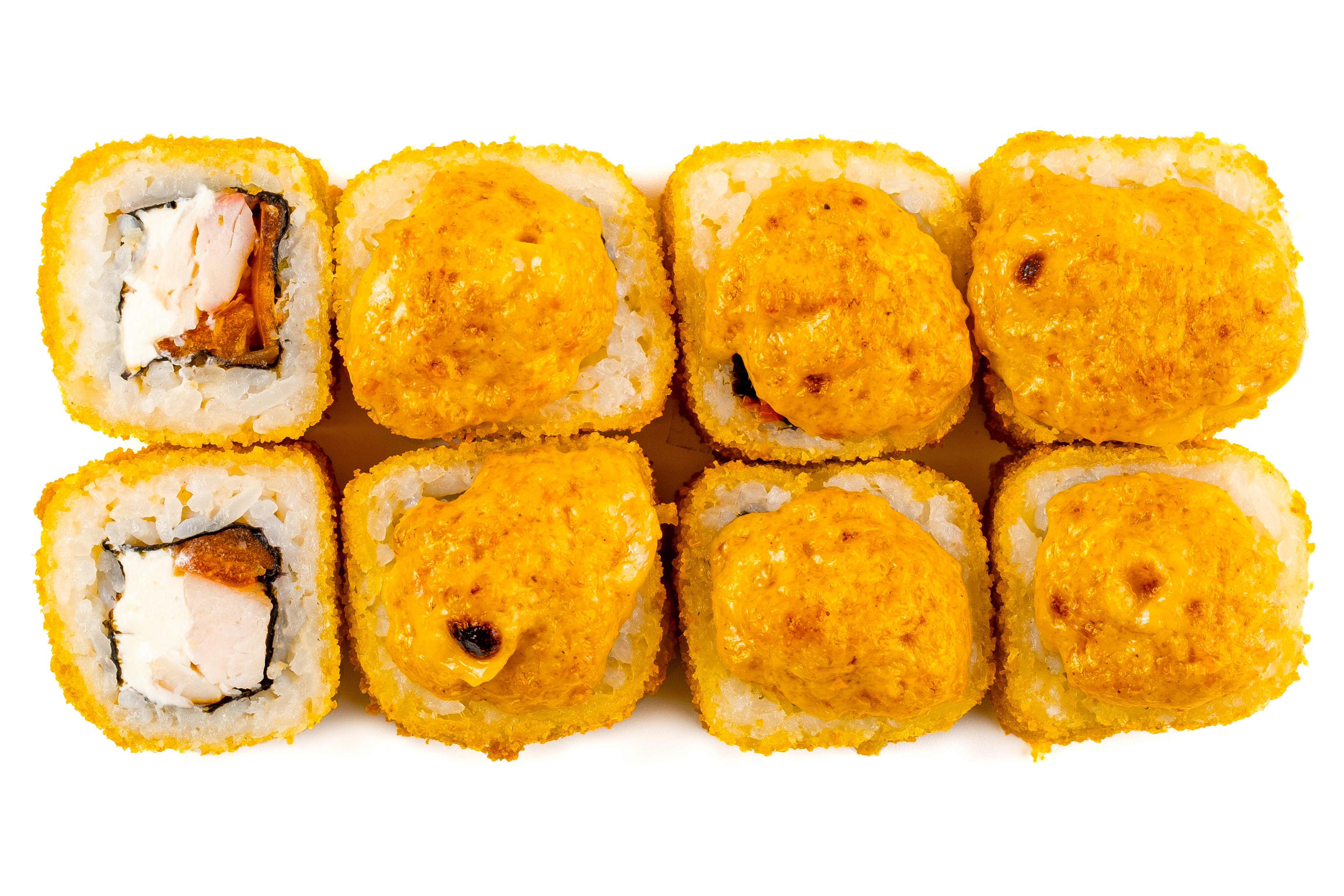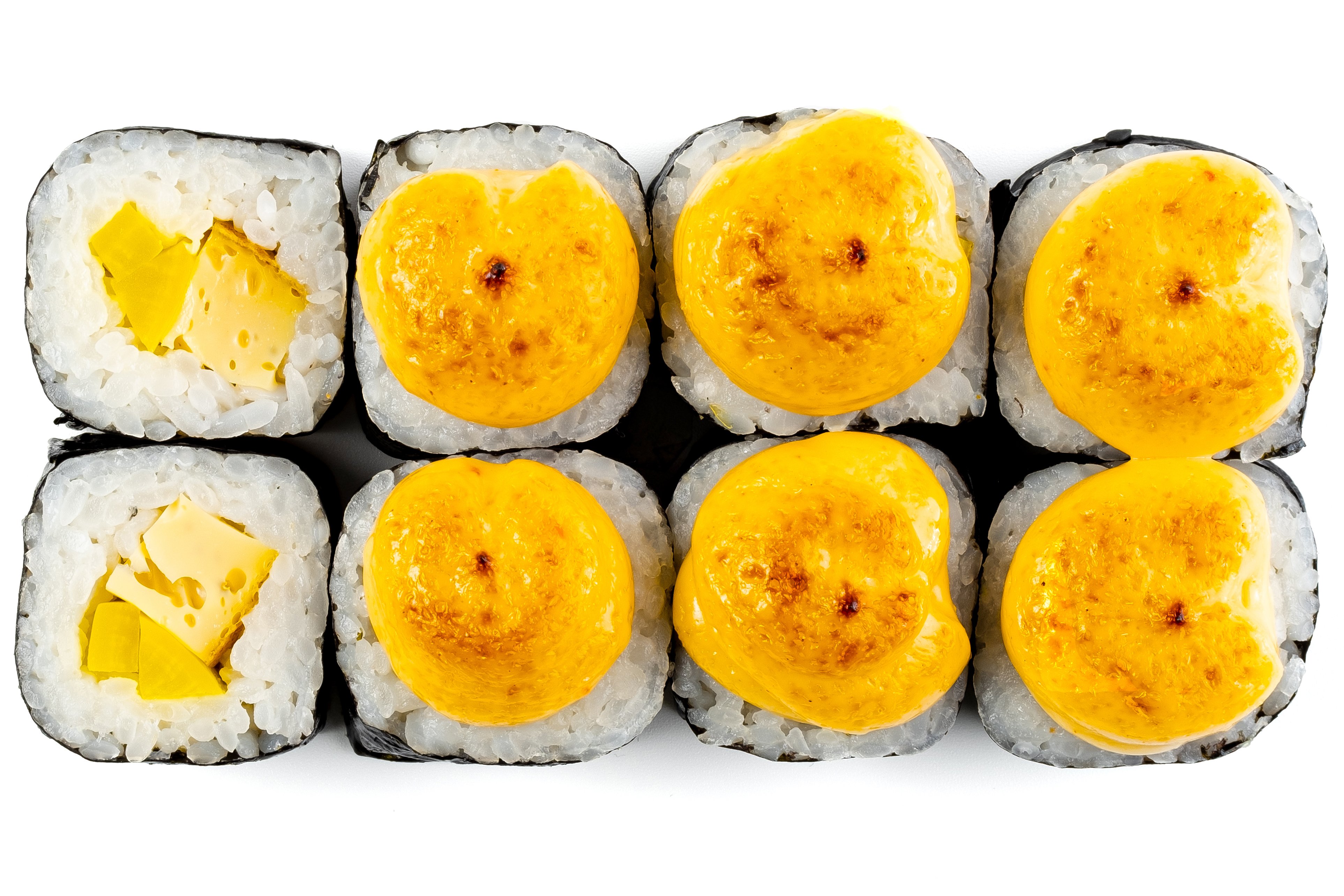 Лосось, Рис, Нори, Сыр, Манго, Сырная шапка, Соус унаги,