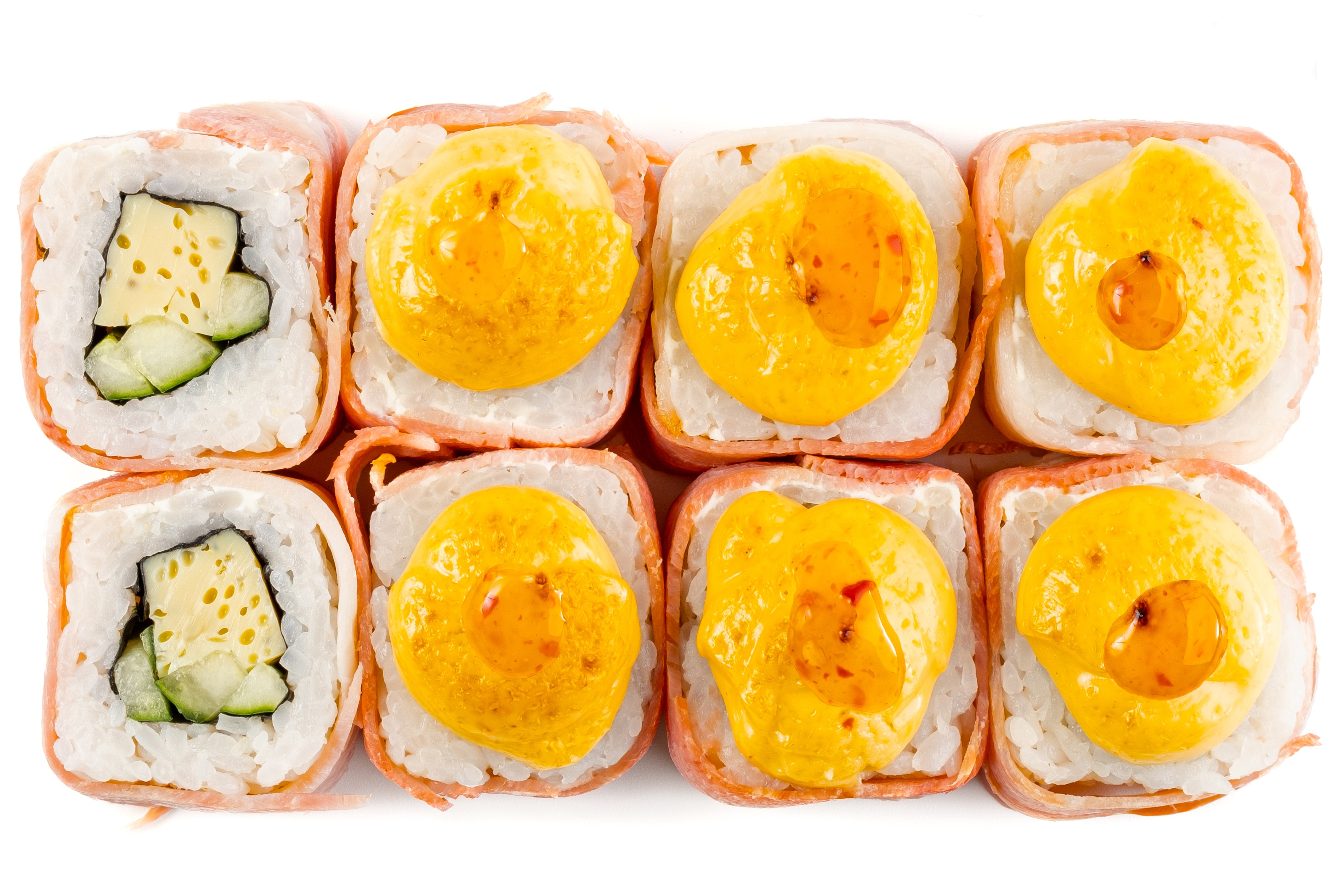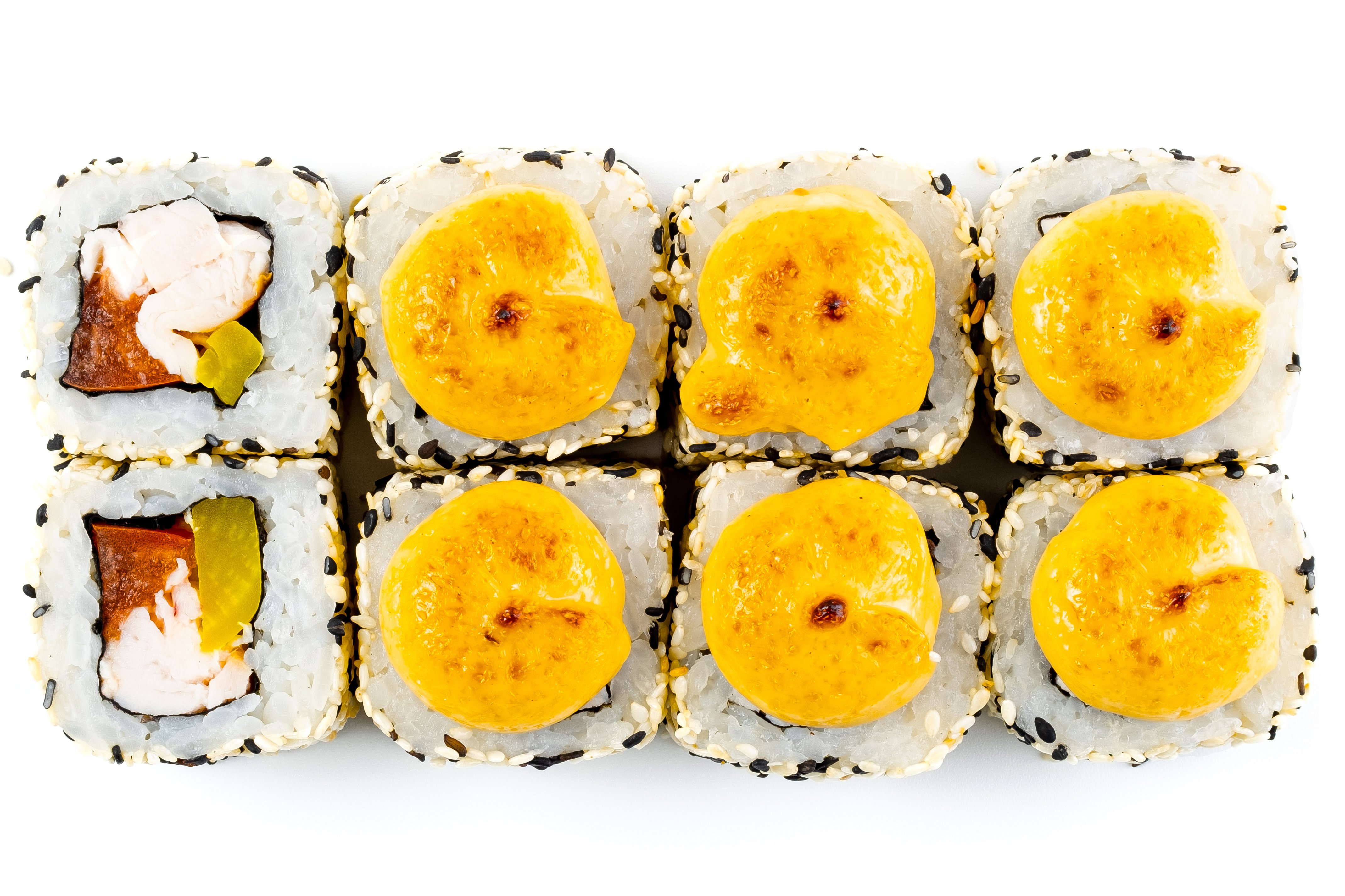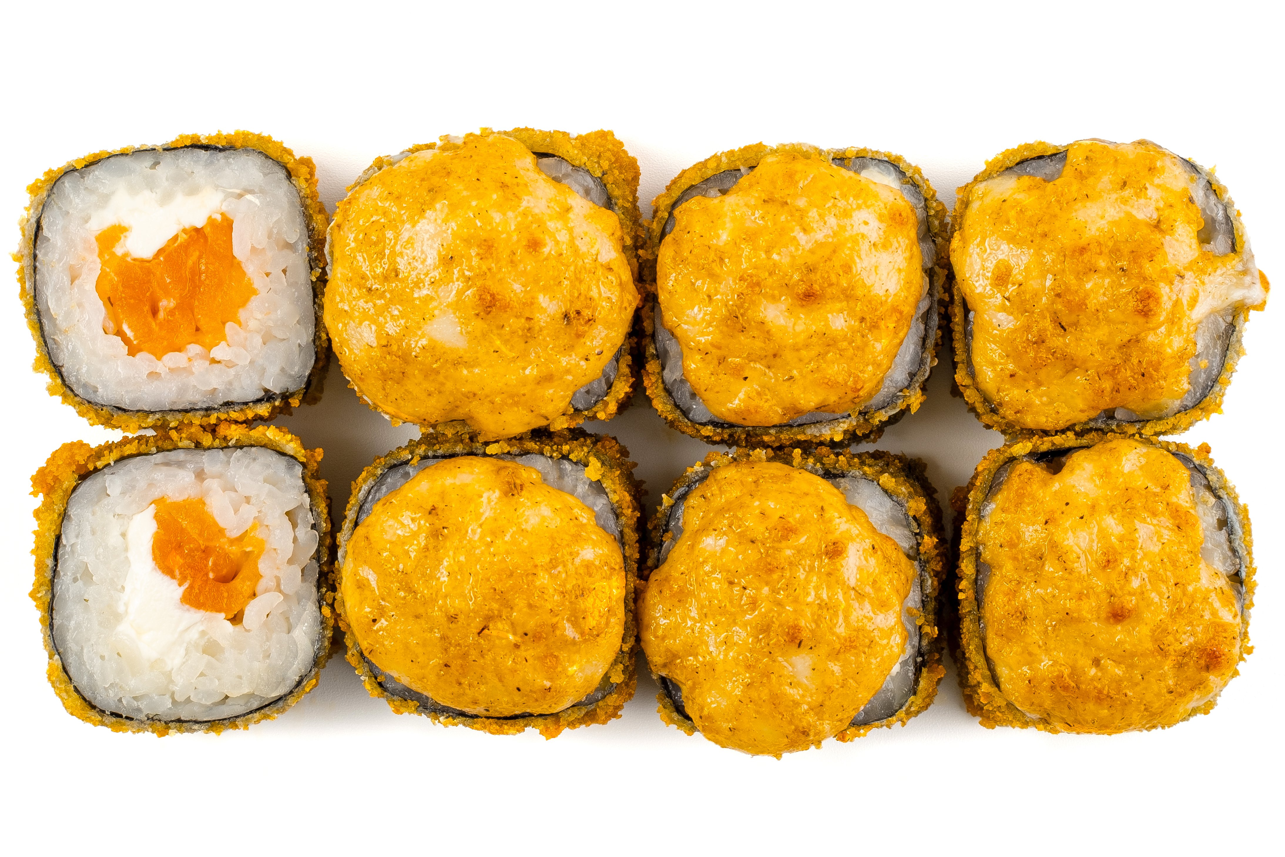 Лосось, Рис, Нори, Сыр, Манго, Сырная шапка, Соус унаги,